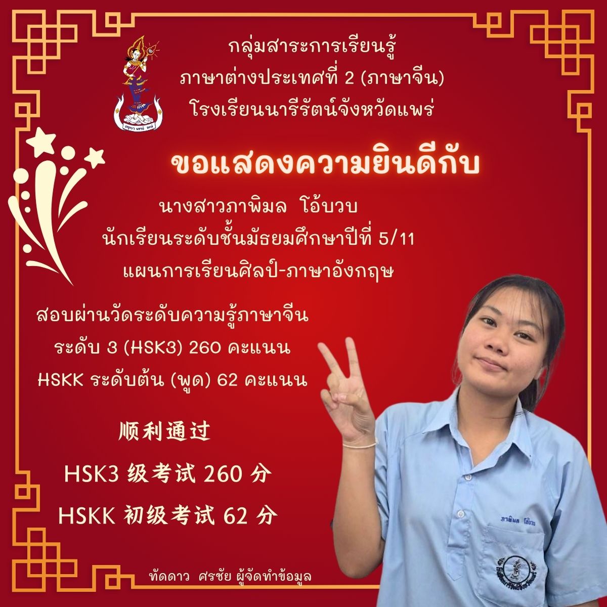 สอบผ่านวัดระดับความรู้ภาษาจีน ระดับ 3 (HSK3) 185 คะแนน