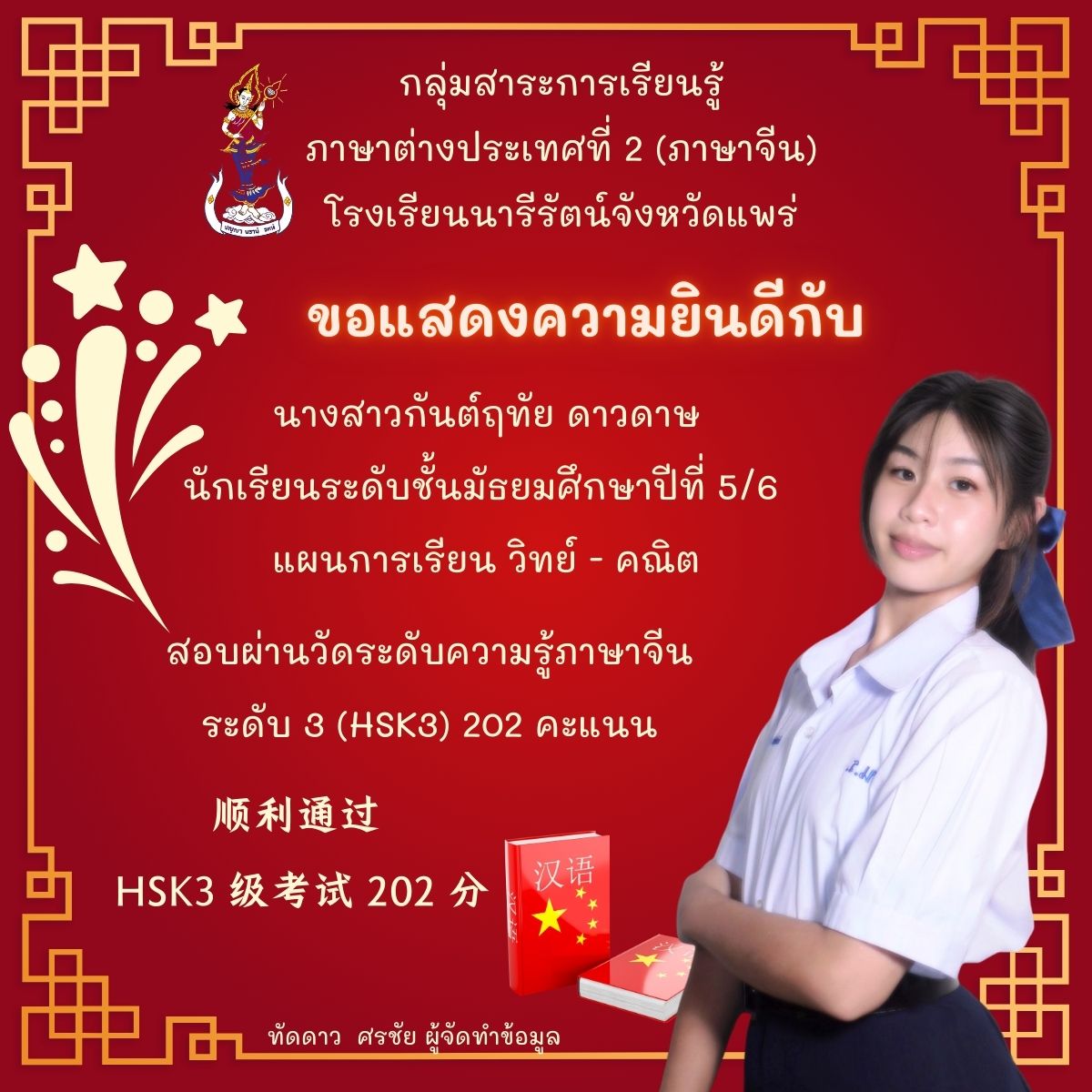 สอบผ่านวัดระดับความรู้ภาษาจีน ระดับ 3 (HSK3) 202 คะแนน