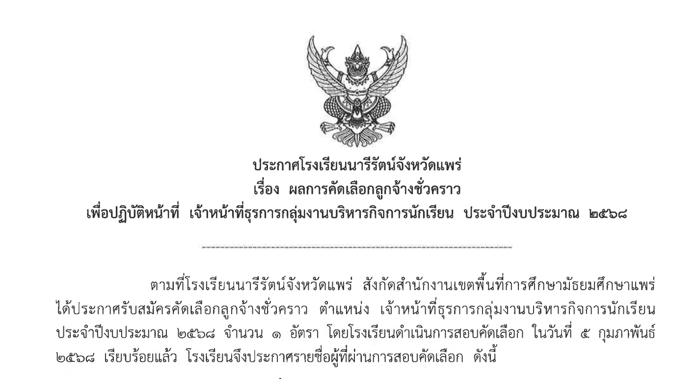 รับสมัครงานโรงเรียนนารีรัตน์จังหวัดแพร่